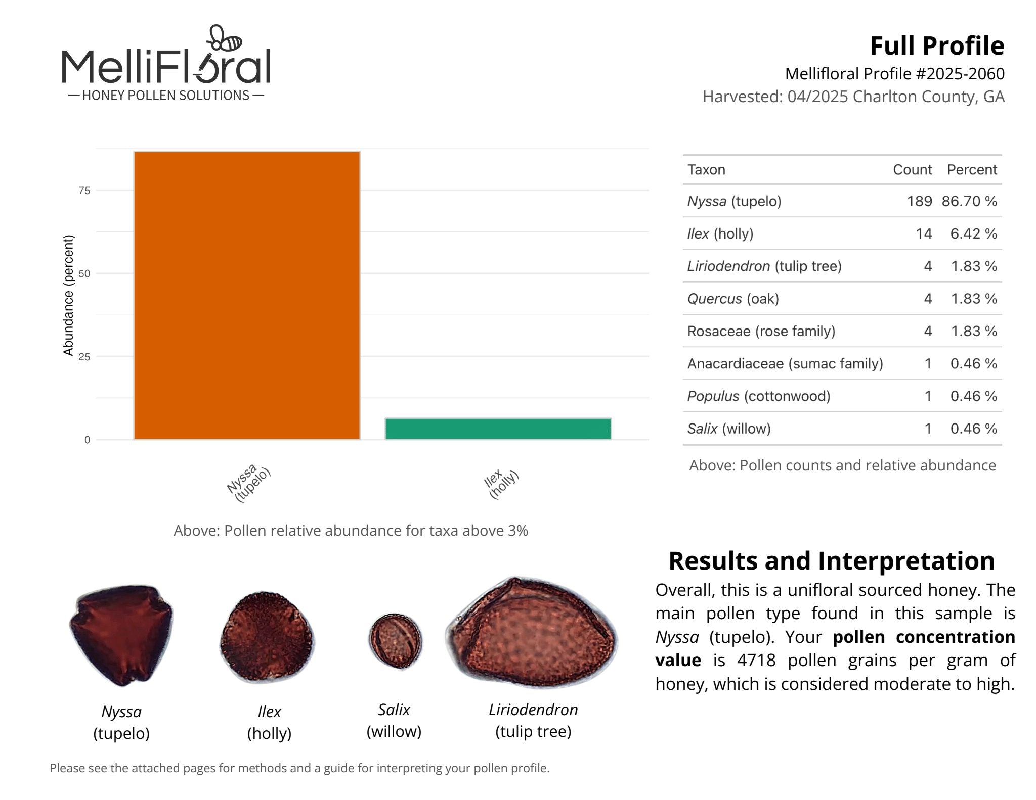 Our Tupelo honey has undergone rigorous laboratory testing, achieving an exceptional purity level of 86.7% pure Tupelo.